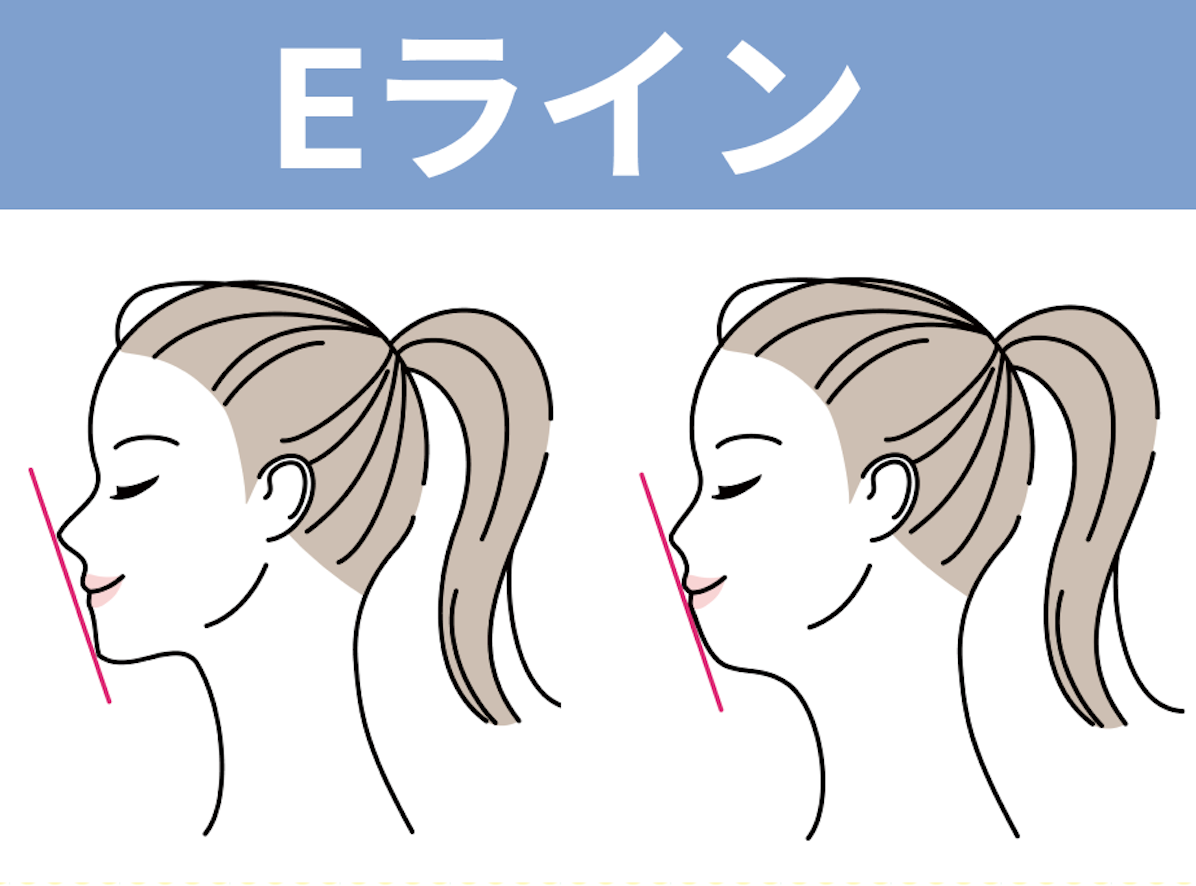 きれいな口元の人は、鼻の先と顎の先端を結んだラインから口元がでないとされています。E-lineが整っていると、横顔がとてもきれいに見えます。