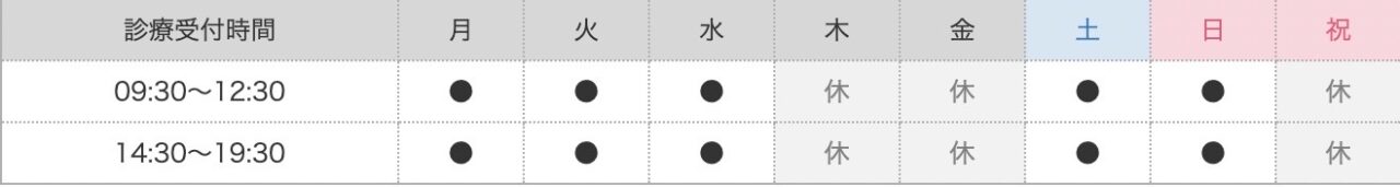 | 診療時間 | 月 | 火 | 水 | 木 | 金 | 土 | 日 | 祝 |