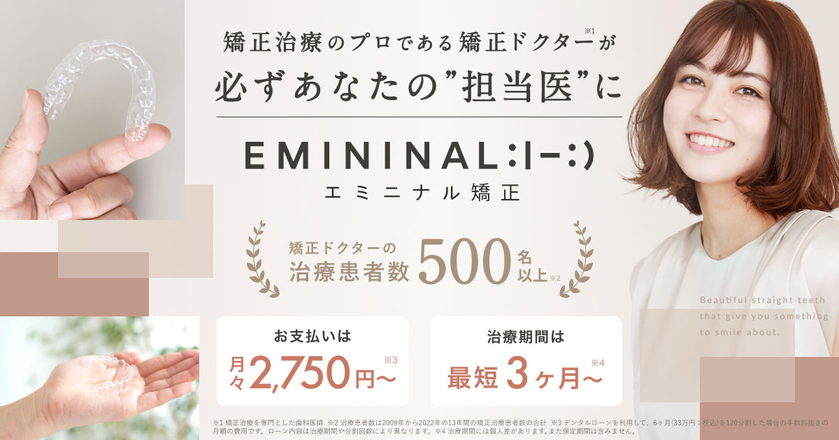 エミニナル矯正は、矯正ドクターにより納得の仕上がりへ導くマウスピース矯正です。治療実績500件以上の矯正治療のプロフェッショナルである矯正ドクターが、必ず”担当医”となる治療体制を構築することで、精度の高い治療を提供しています。