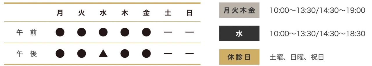 | 11:00〜20:00 | ● | ● | ● | – | – | – | – |