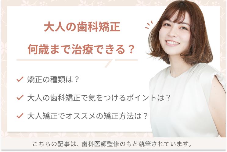 歯並びにお悩みの方の解決の手段として、歯科矯正があります。しかし、「大人になってから矯正を始めても効果があるのかな?」「何歳まで矯正可能がなんだろう?」などの疑問から、なかなか歯科矯正に踏み出せない方も多いのではないでしょうか?